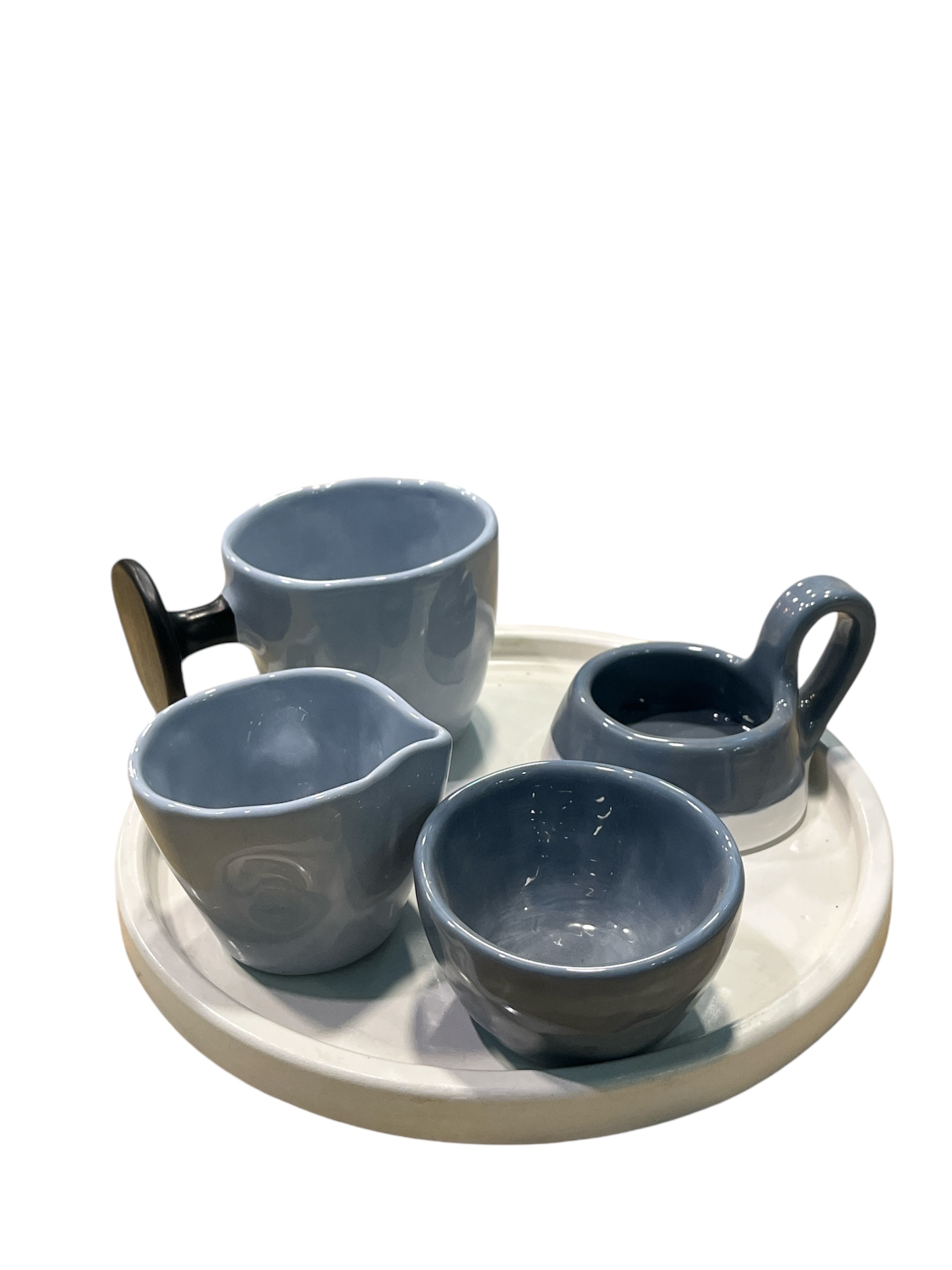 این ست سرامیکی تشکیل شده از 5 تکه که شامل یک عدد ماگ یک کاسه تنقلات خوری یک فنجان شیر خوری و یک ظرف دسته دار که میتوان به عنوان ظرف پذیرایی (شکلات-خرما-آجیل و ...)استفاده کرد و یک عدد سینی که جنس آن متفاوت بوده و از سنگ میباشد