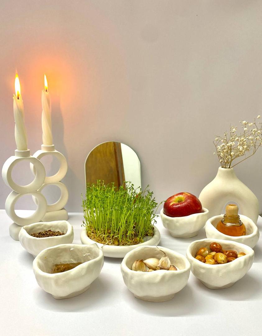 ۷ ظرف با اندازههای استاندارد – مناسب برای چیدن انواع سینهای هفتسین و دکوراتیو کردن میز نوروزی.
