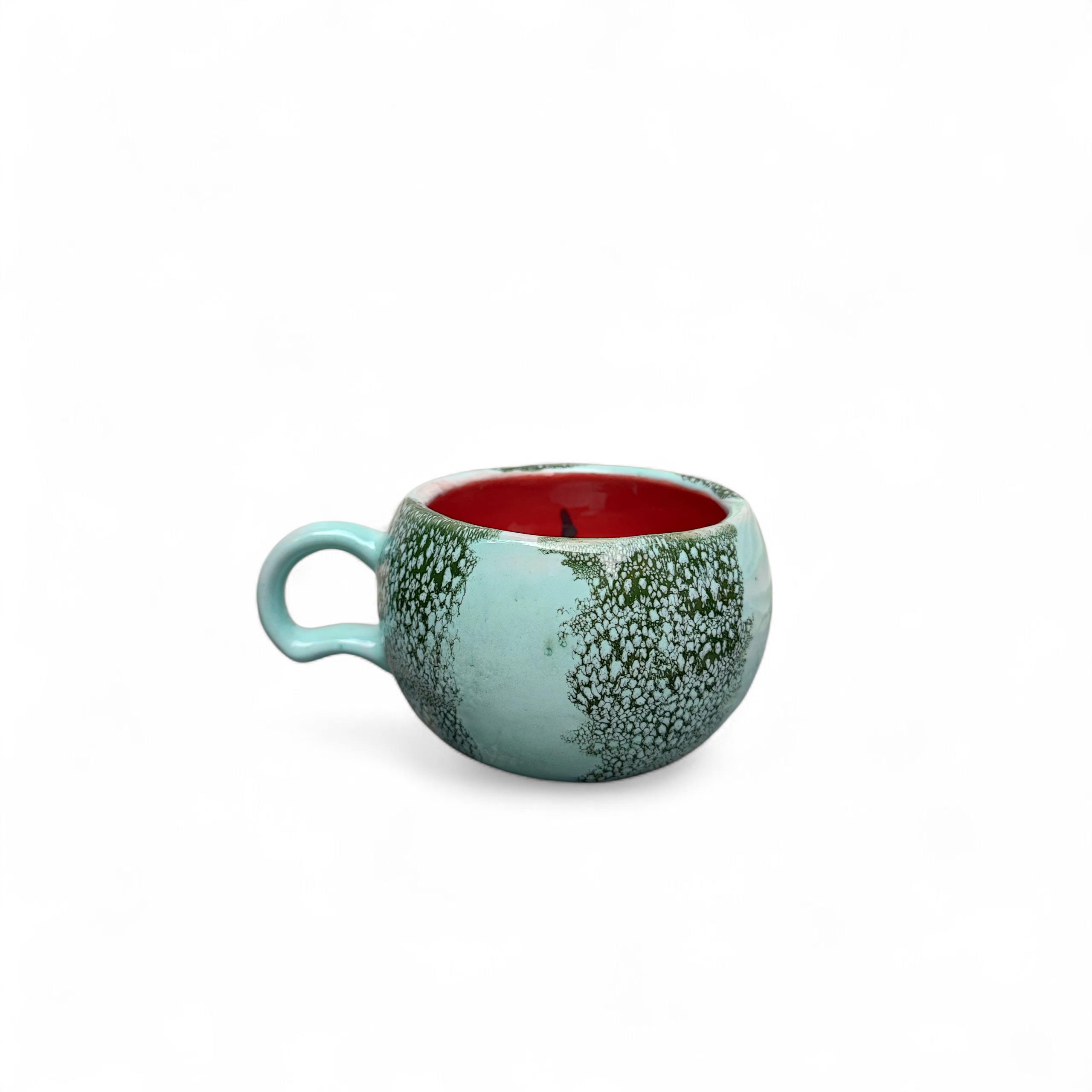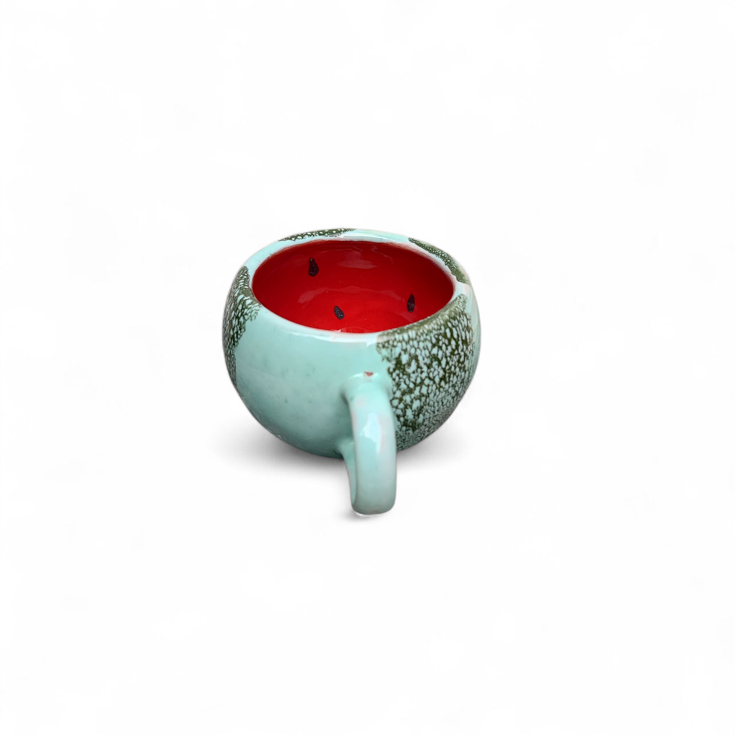 طراحی این فنجان از هندوانه الهام گرفته شده؛ میوهای که برای همه ما یادآور خنکی، طراوت و حس زندگی در روزهای گرم تابستونه است. داخل فنجان با رنگ قرمز براق و دانههای مشکی طراحی شده تا شبیه برش هندوانه واقعی باشه، و بیرونش هم با ترکیب سبز روشن و تیره لعابکاری شده تا بافت پوست هندوانه رو بهزیبایی تداعی کنه.