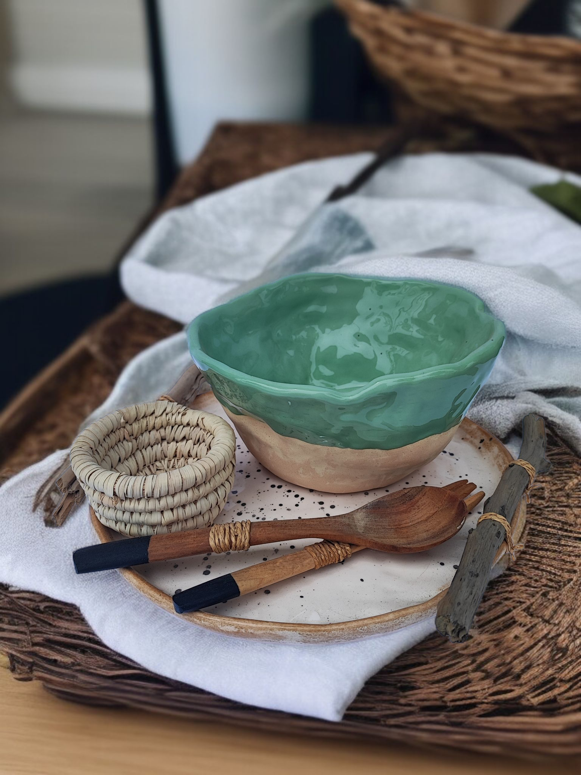 دارای کاسه و پیالههای دستساز با لعاب سبز خاص و طراحی ارگانیک
