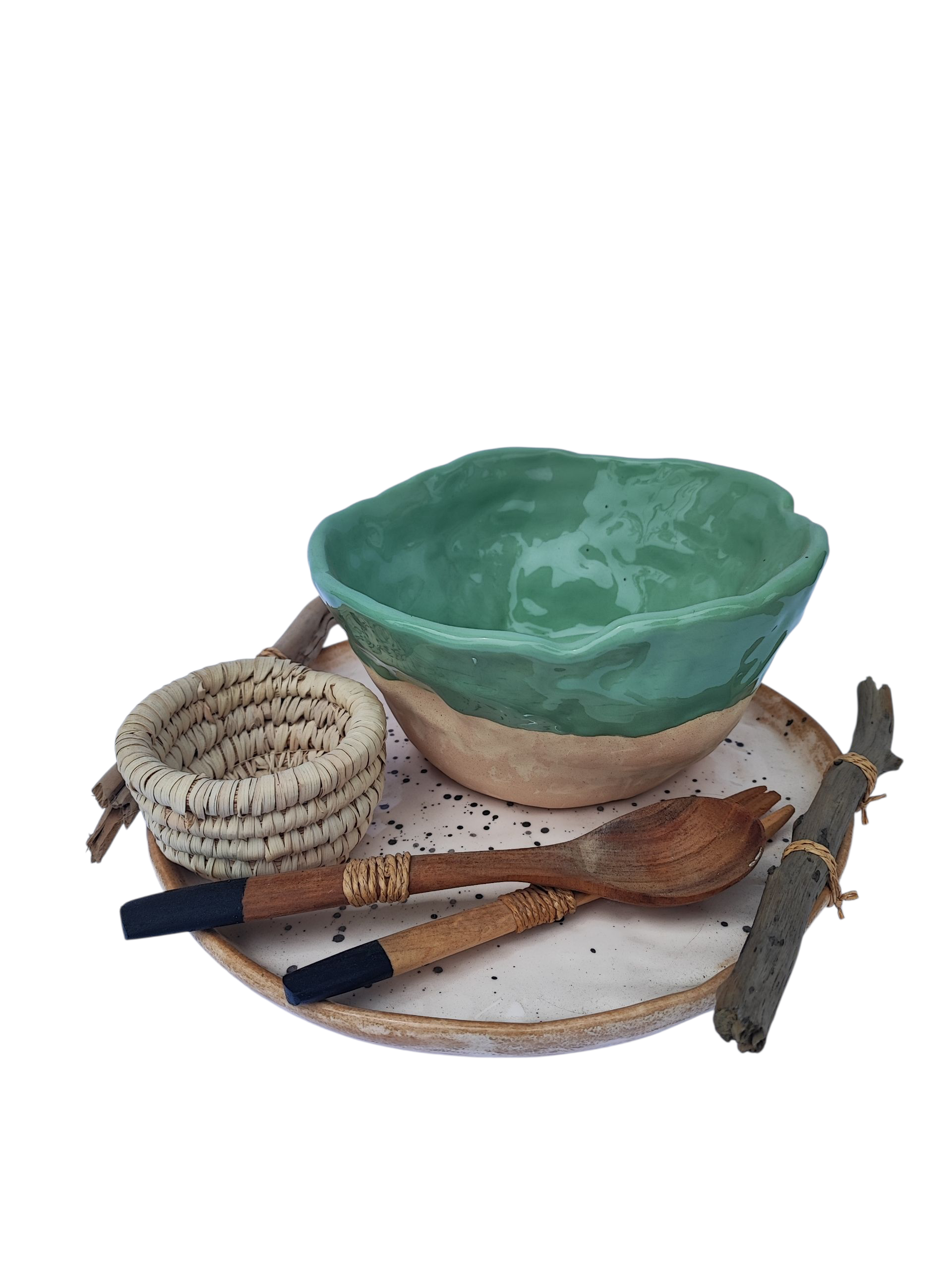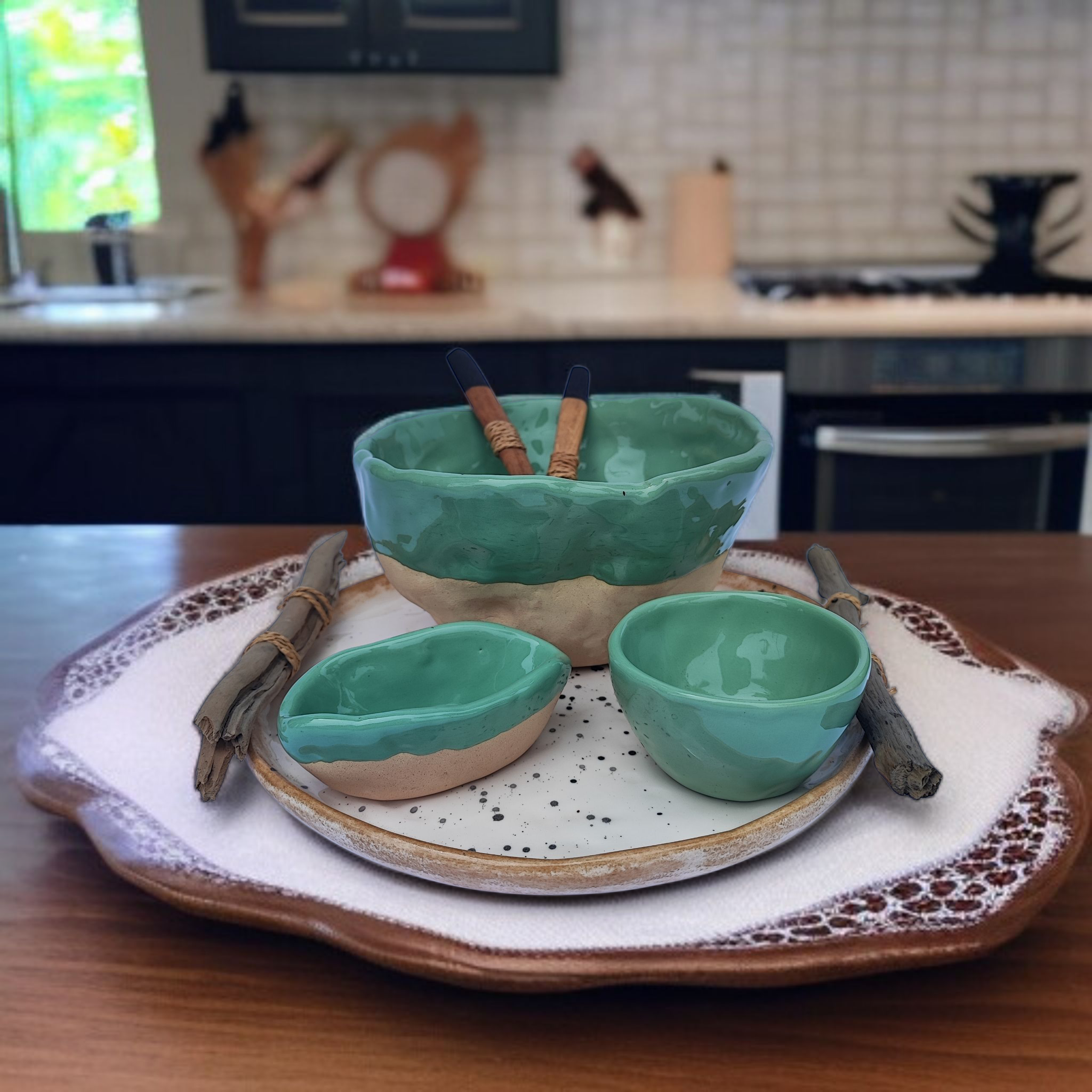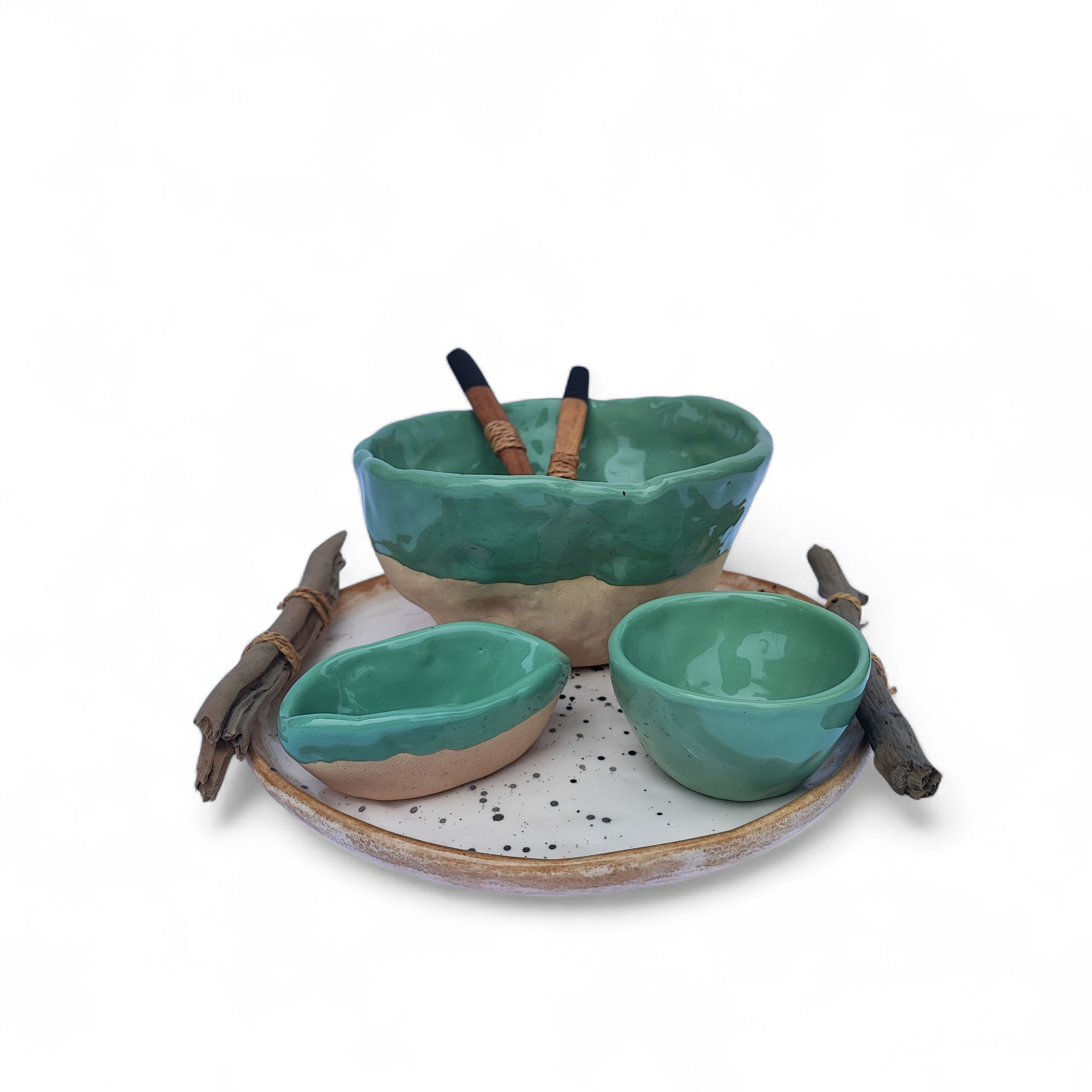 هر قطعه با ظرافت تمام و بهصورت کاملاً دستساز ساخته شده و دارای لعاب سبز آرامشبخش با بافتی طبیعی و نیمهمات است که جلوهای خاص و منحصربهفرد ایجاد میکند. طراحی این مجموعه ترکیبی از هنر سنتی و سبک مدرن است؛ مناسب برای کسانی که به دنبال ظروفی خاص، کاربردی و دکوری هستند.
