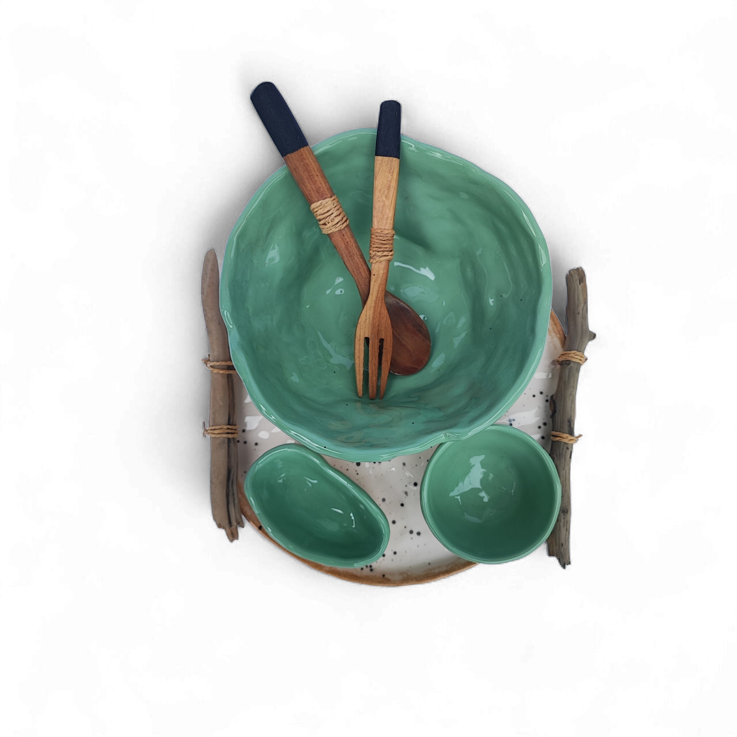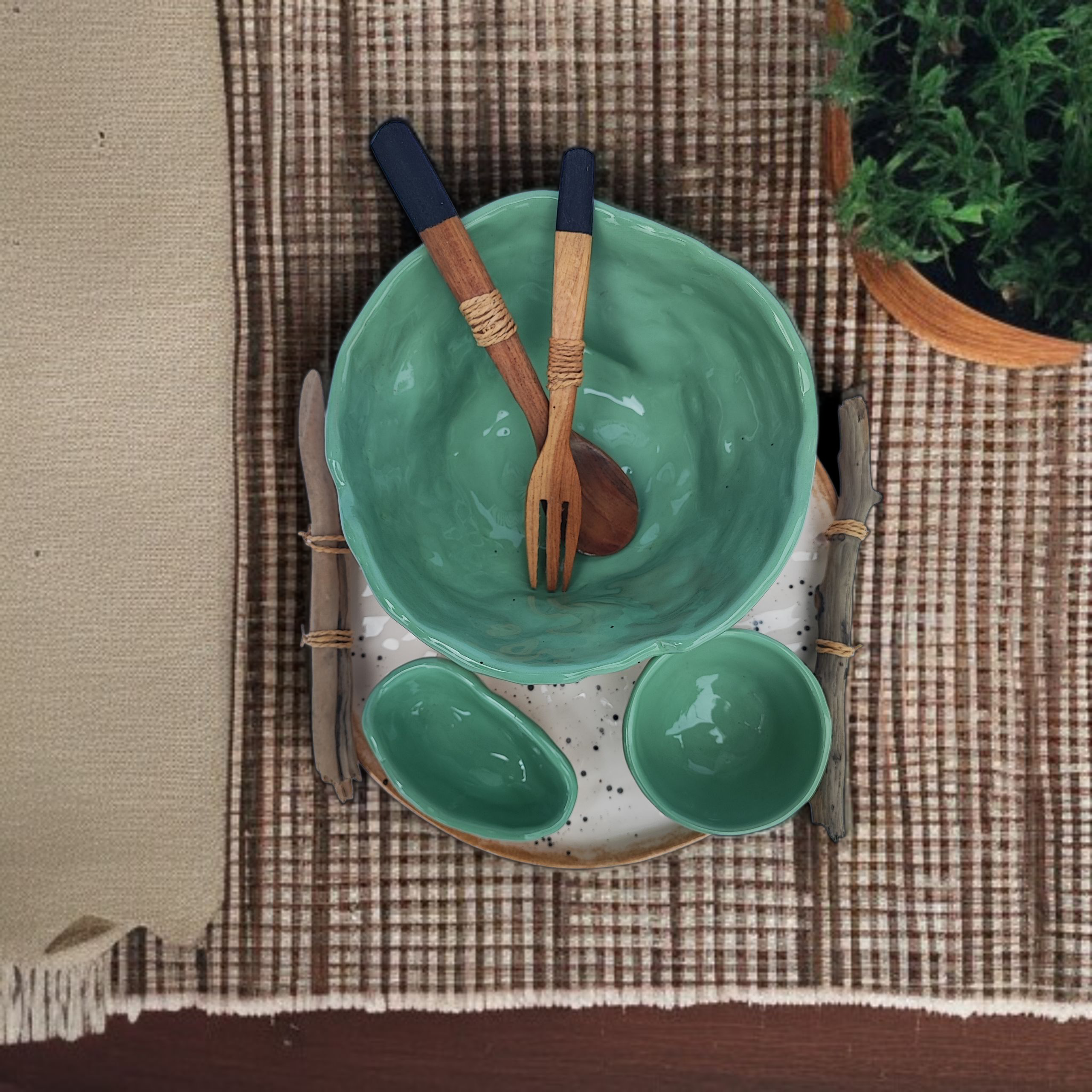 این ست زیبا نهتنها برای استفاده روزمره مناسب است بلکه بهعنوان کادویی خاص و ماندگار برای عزیزانتان نیز انتخابی فوقالعاده است. ترکیب هماهنگ رنگ سبز لعابدار با چوب طبیعی حس آرامش و طبیعت را به فضای خانهتان میآورد.