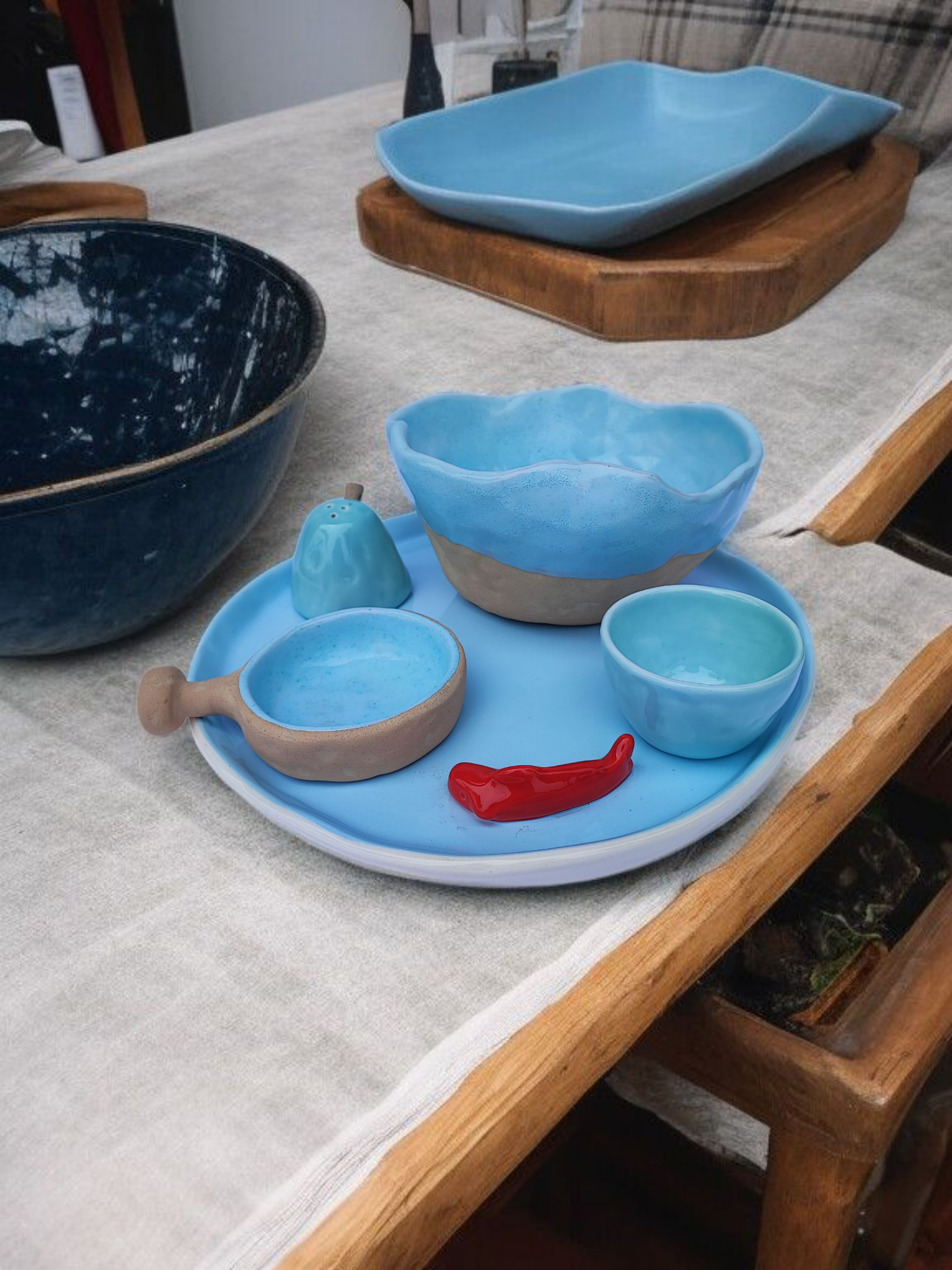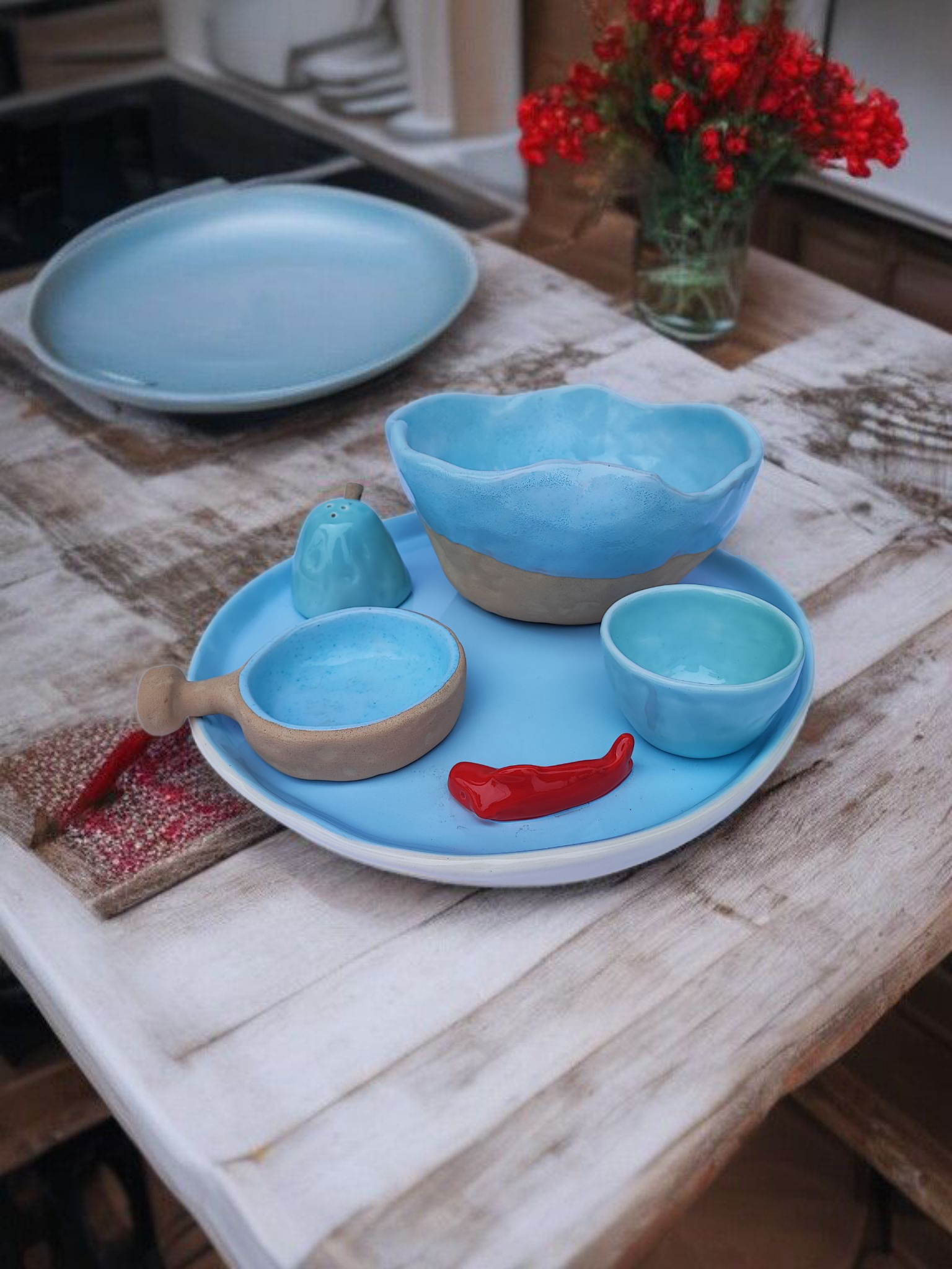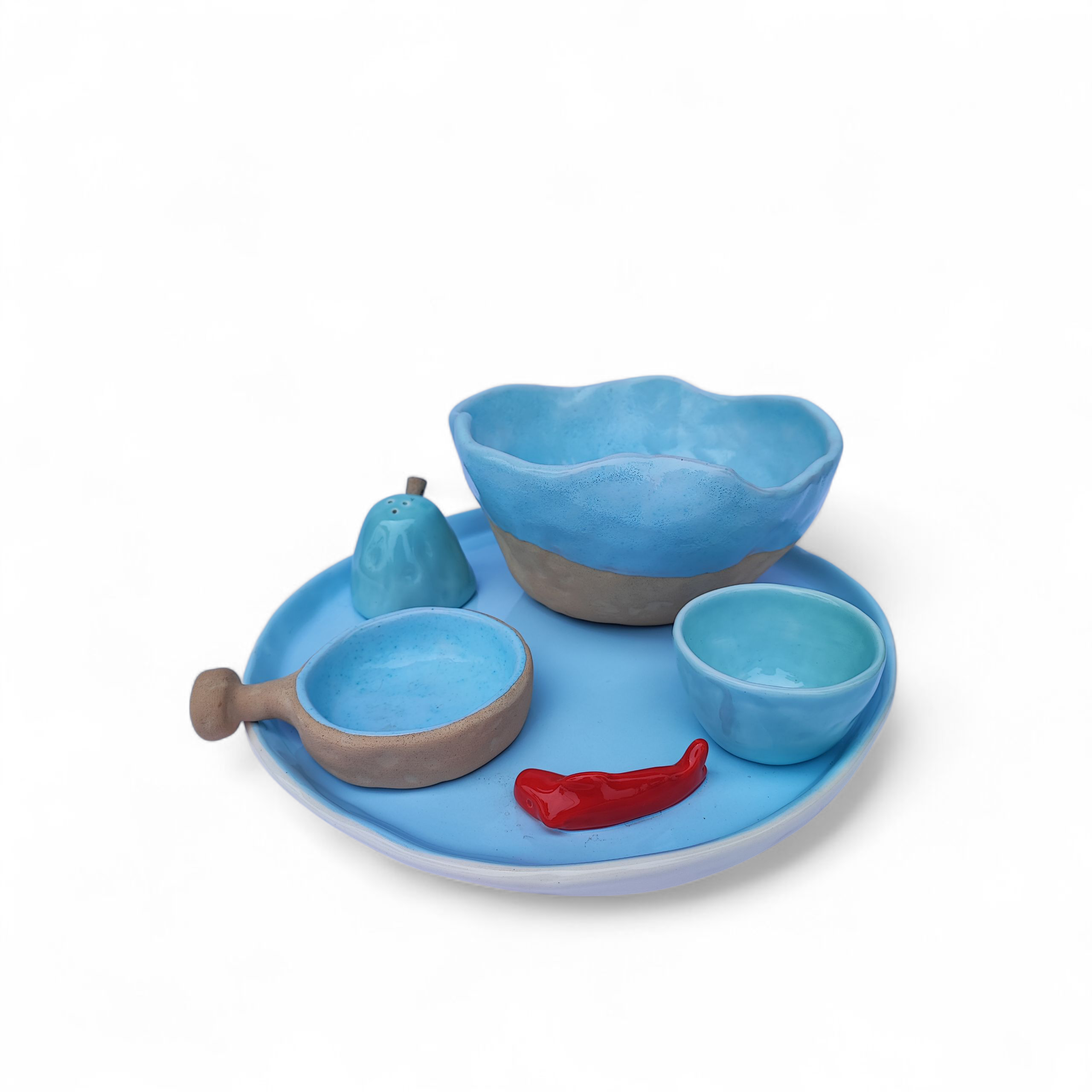ست سرامیکی آبی دستساز با ماهی قرمز تزئینی — مجموعهای خاص و هنری برای سرو، دکور یا هدیه. ساختهشده از سرامیک مرغوب با لعاب آبی براق و بافت خاکی طبیعی.