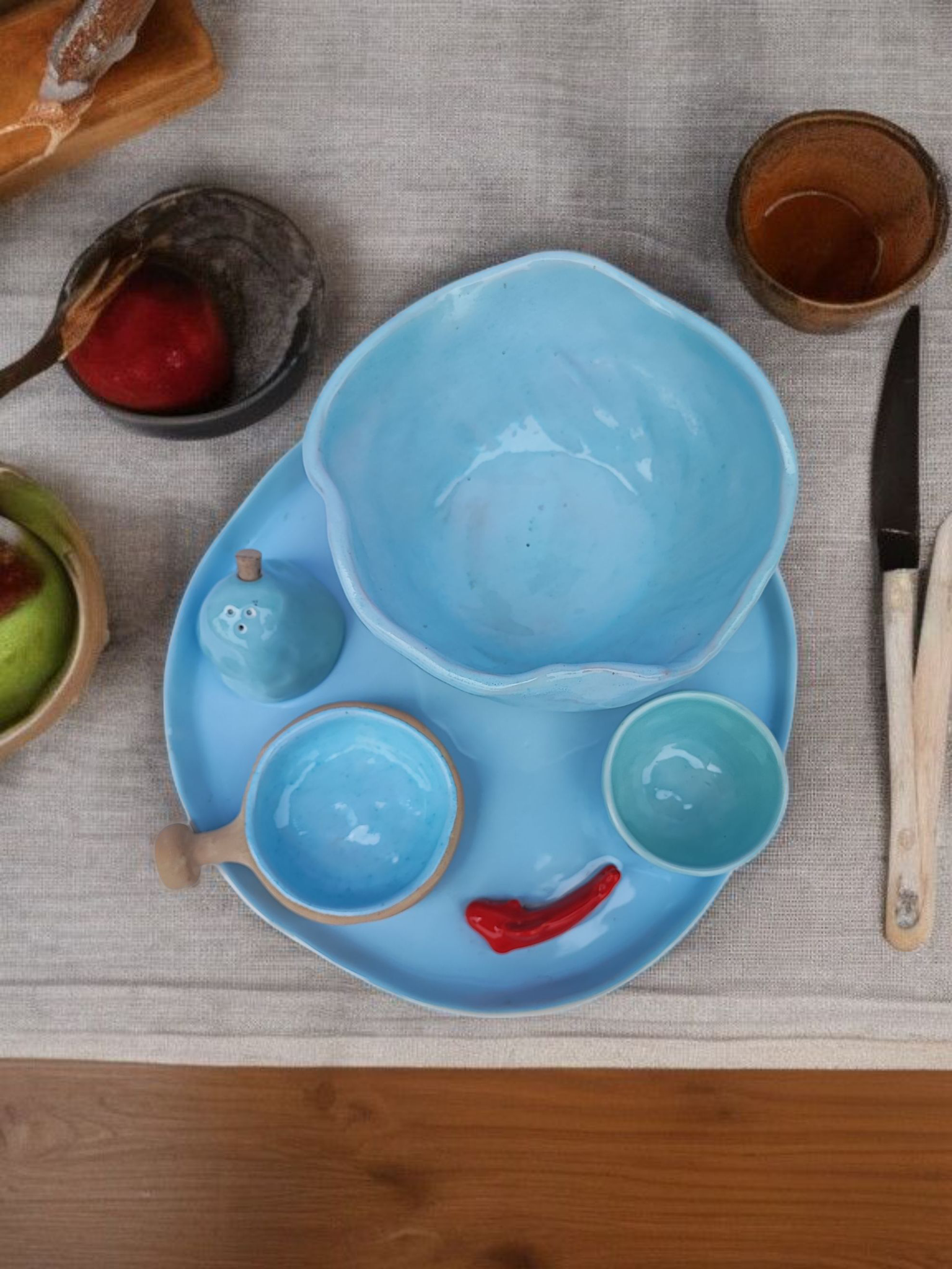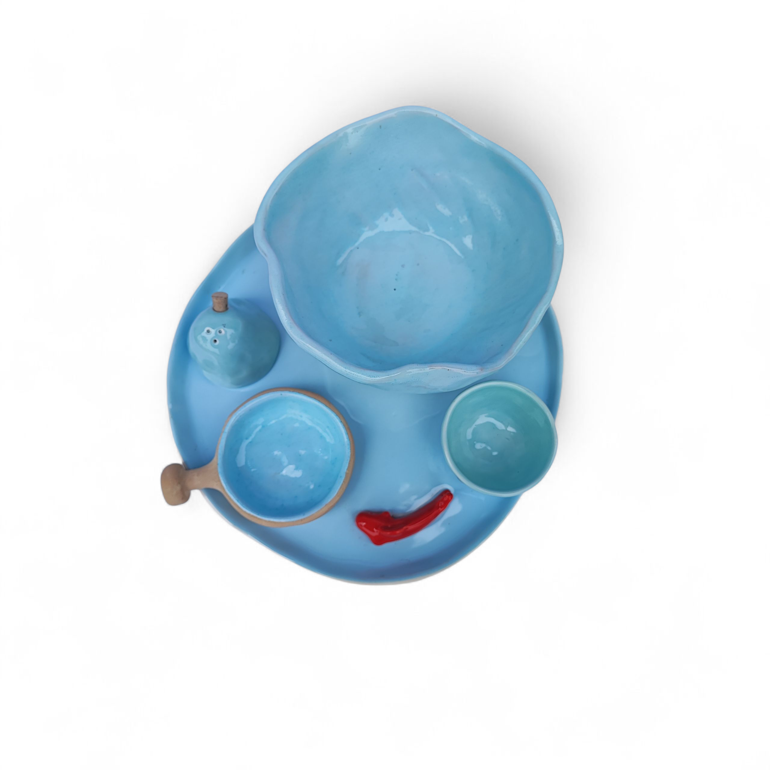 هر قطعه از این مجموعه با دستان هنرمند یک سفالگر ساخته شده و نتیجهی ساعتها کار دقیق، عشق و خلاقیت است. لعاب آبی آرامشبخش با درخشش ملایم خود، در تضاد زیبا با بافت خاکی طبیعی بخش پایینی ظرفها قرار گرفته و جلوهای گرم و دلنشین ایجاد کرده است.